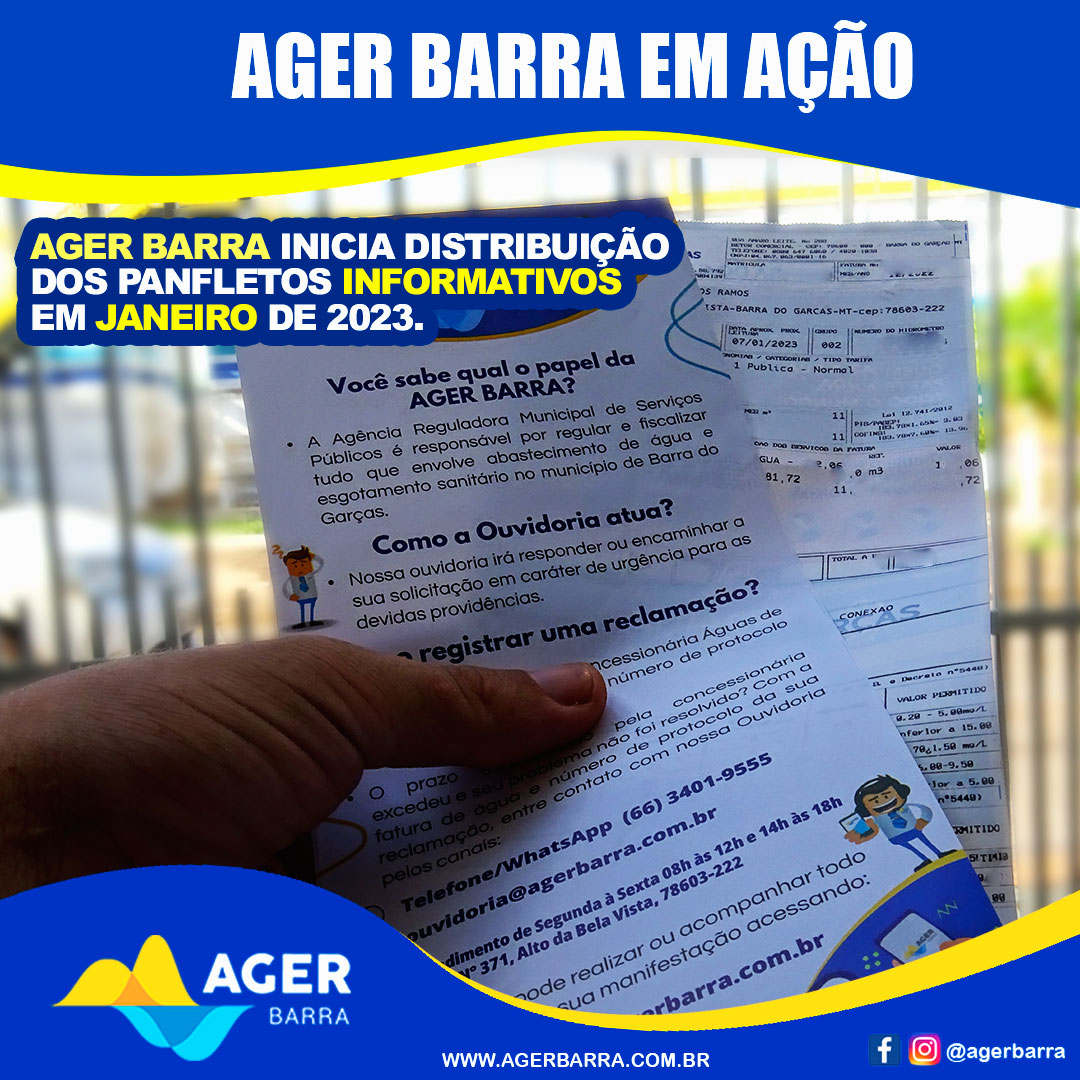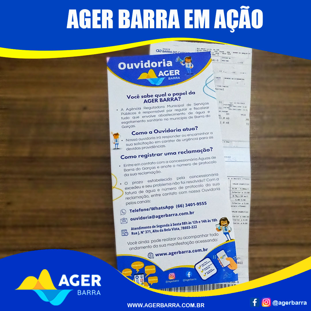 A equipe de ouvidoria da Ager Barra dará início a distribuição dos materiais informativos. O objetivo é informar e orientar a população sobre a atuação da Agência e os procedimentos que os usuários devem adotar para registrar sua manifestação. Os panfletos serão anexados à fatura de água, com a distribuição no início de janeiro de 2023. Todo material foi elaborado de forma simplificada e figurativa, para facilitar o entendimento da população em geral.