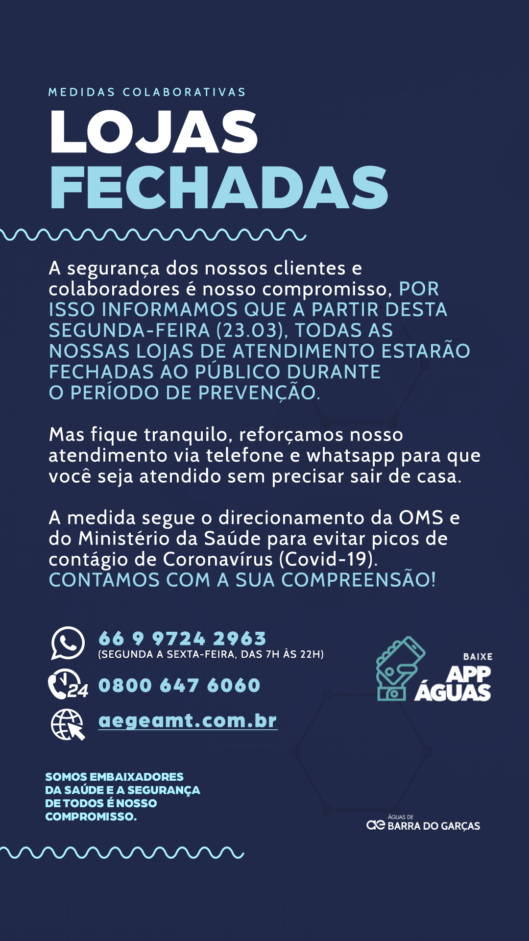 ÁGUAS DE BARRA DO GARÇAS SUSPENDE ATENDIMENTO PRESENCIAL AO PÚBLICO