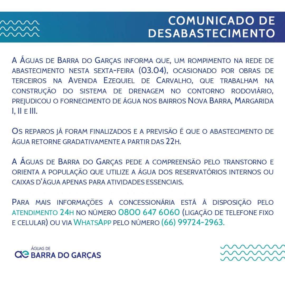 A Águas de Barra do Garças informa que, um rompimento na rede de abastecimento nesta sexta-feira (03.04), ocasionado por obras de terceiros na Avenida Ezequiel de Carvalho, que trabalham na construção do sistema de drenagem no contorno rodoviário, prejudicou o fornecimento de água nos bairros Nova Barra, Margarida l, ll e lll.