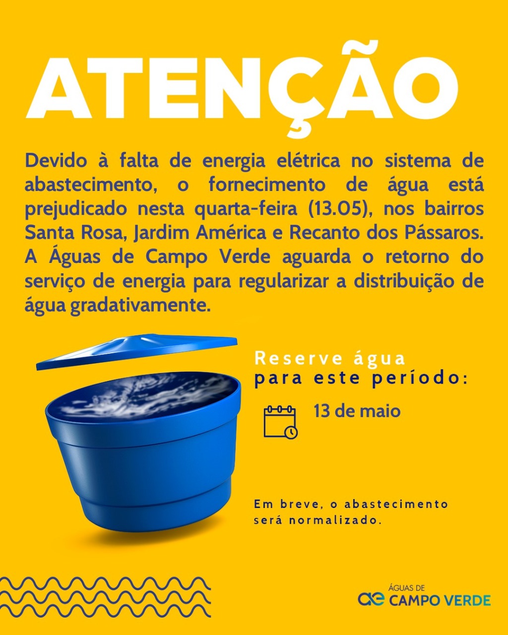 A Águas de Campo Verde informa que, devido que devido à falta de energia elétrica no sistema de abastecimento, o fornecimento de água está prejudicado nesta quarta-feira (13.05), nos bairros Santa Rosa, Jardim América e Recanto dos Pássaros.