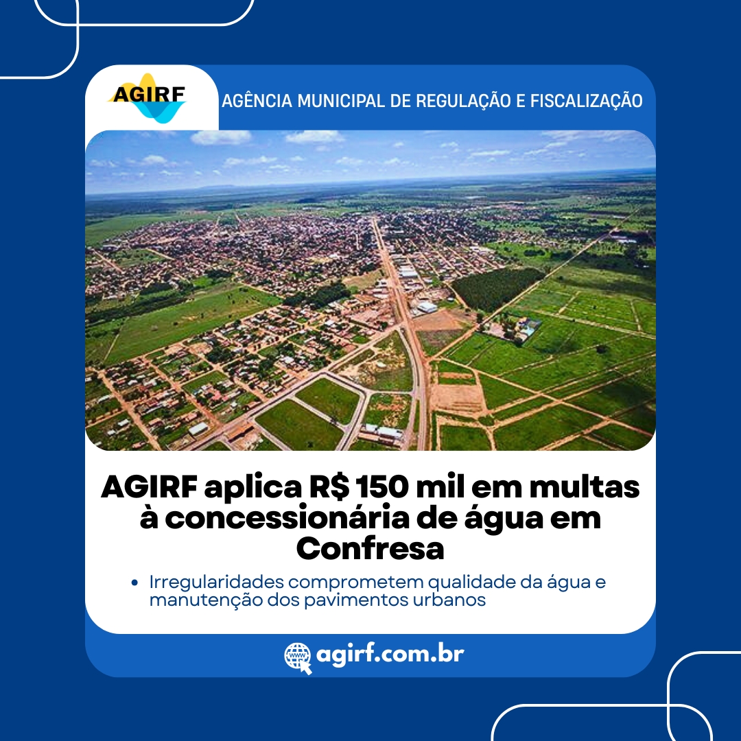 A Agência Municipal de Regulação e Fiscalização (AGIRF) aplicou cerca de R$ 150 mil em multas à concessionária responsável pelo abastecimento de água em Confresa (MT), após constatar diversas irregularidades durante vistorias realizadas entre os meses de junho e julho de 2025.