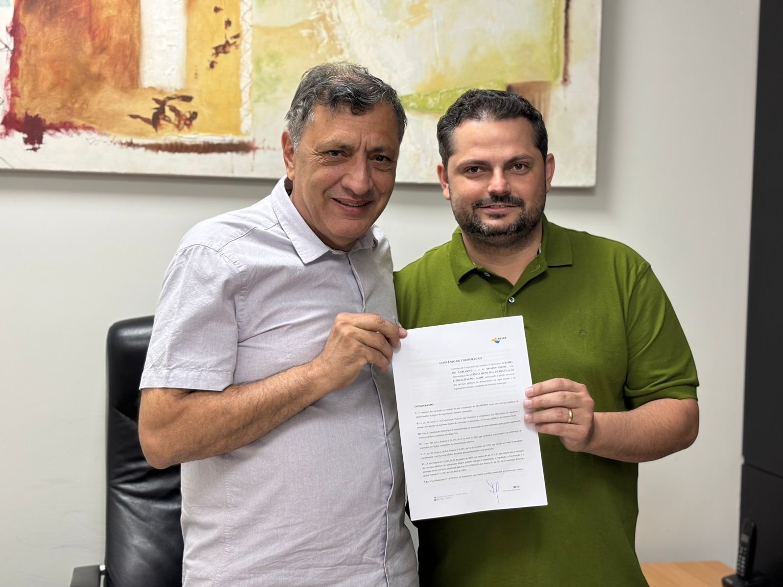 A cerimônia de assinatura ocorreu no gabinete municipal e contou com a presença do prefeito Francisco Ferreira Mendes Júnior (Chico Mendes), do vice-prefeito Antônio Martins Teixeira e do diretor institucional da AGIRF, Benier Marcos Silva.