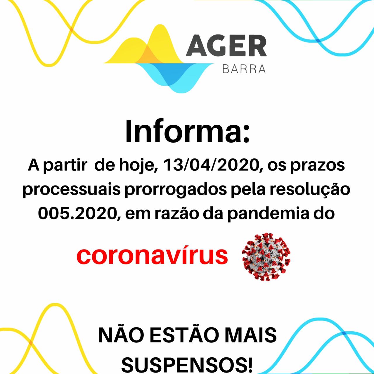 A partir de hoje, 13/04/2020, os prazos processuais prorrogados pela resolução 005.2020, em razão da pandemia do coranavirus, não estão mais suspensos.