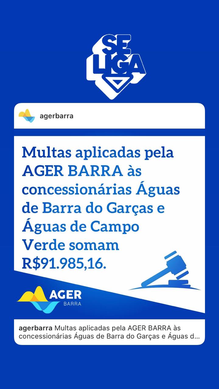 Multas aplicadas pela AGER BARRA às concessionárias Águas de Barra do Garças e Águas de Campo verde somam R$ 91.985,16.
