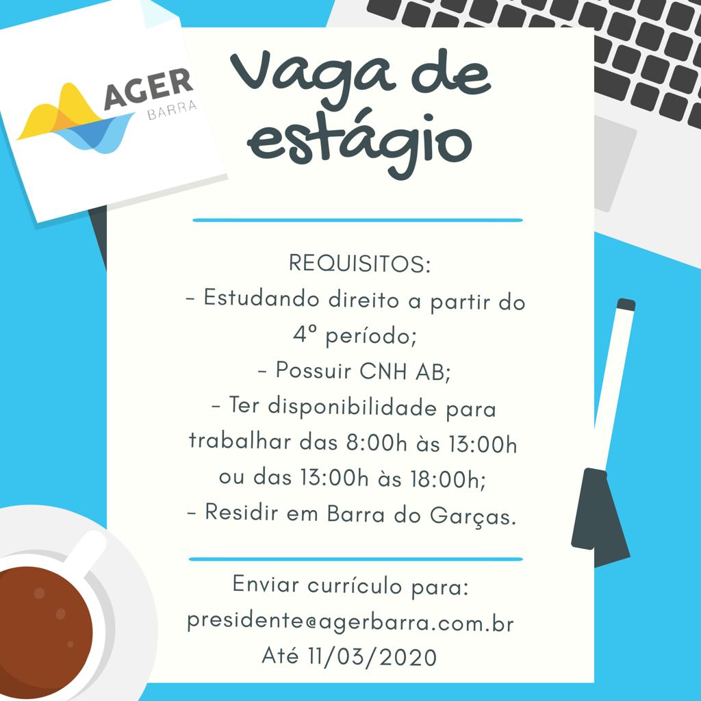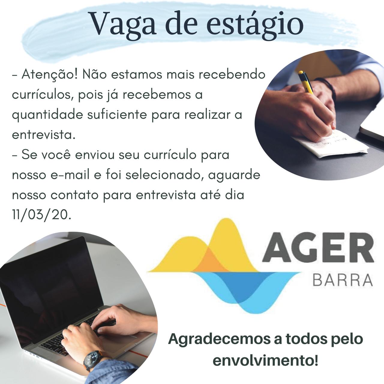 A AGER BARRA está contratando estudante de direito para estágio remunerado, conforme Resolução 002.2020.
